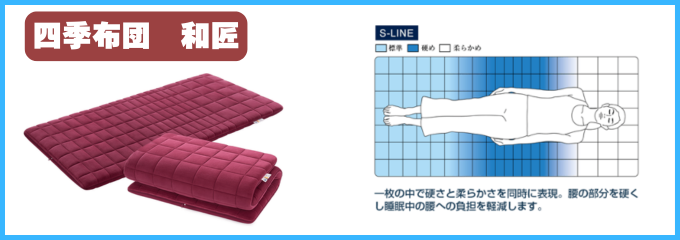 | 四季布団 和匠 | 159,500円~ S/SL/SD/D | ![]() 標準・硬め・柔らかめ 両面仕様 | 有り 吸湿発熱綿 |