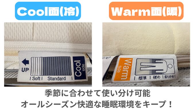 それに対しエアウィーヴ01、02は「Cool面」と「Warm面」の両面仕様。季節ごとに使い分けることでオールシーズン快適に使えます。