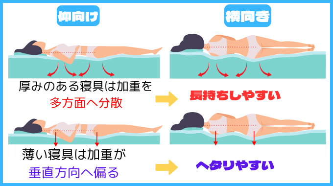 薄い寝具は体重を逃がしにくく厚みがあるマットレスに比べへたりやすい傾向にあります。
