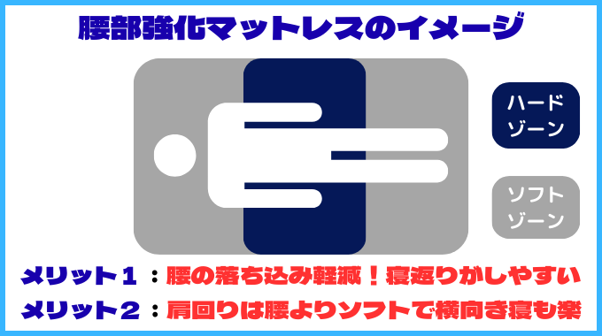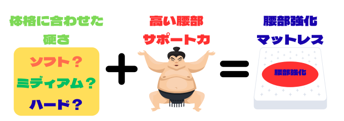特に腰痛対策には、「体格に合わせた硬さ」+「高い腰部サポート力」の「腰部強化マットレス」がおすすめです。