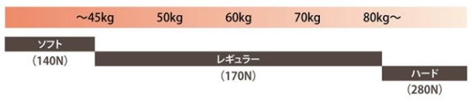 Nとは「ニュートン」という日本産業規格(JIS)で規定している硬さの試験によって測定された、主にウレタンの硬さや反発力を数値化した単位。数値が大きいほど硬い(反発力が高い)と感じます。