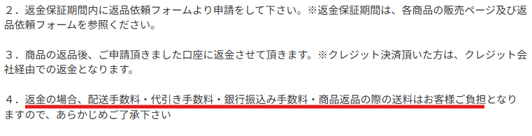 ④返品には一部費用が自己負担になる