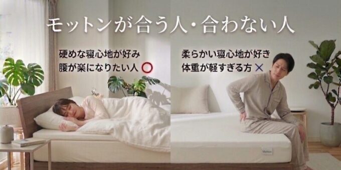 今の睡眠環境に不満がある方腰に悩みを抱えている方、薄くてもしっかりしたマットレスが欲しい方は是非モットンを候補にしてみてはいかかでしょうか。