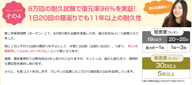 耐久性はコイル品質やウレタン密度も大きく影響します。